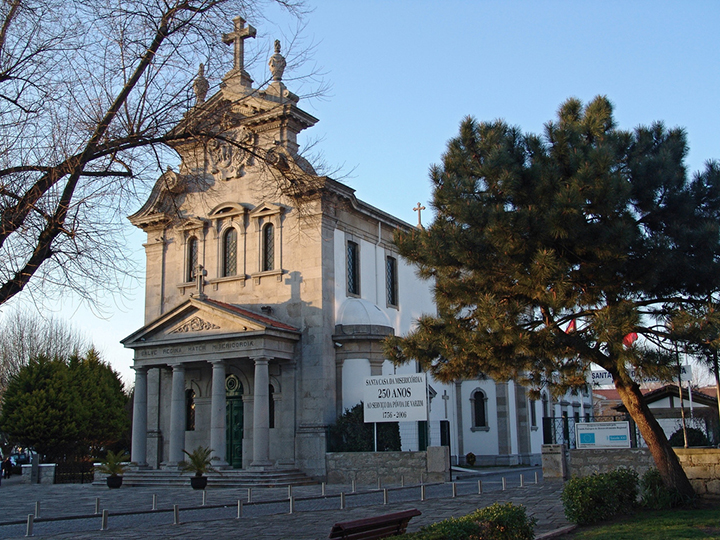 A nova igreja da Misericórdia tem traço inicial do arquitecto Adães Bermudes, mas versão final do Arquitecto portuense Peres Guimarães. Foi construída no lugar da primeira capela dos mortos que antigamente era o cemitério da irmandade. Em 1909 sendo então o Provedor o Dr. António Rodrigues da Costa Silveira, foi posta a concurso a empreitada da nova igreja, tendo como base de licitação a quantia de oito mil quatrocentos e sessenta reis. A obra foi adjudicada ao mestre canteiro António Fernandes Dias, de Mujães, Viana do Castelo, por 15 contos. A primeira pedra foi lançada no dia 2 de Novembro de 1909. Para sua construção aproveitando-se o material da igreja em ruínas (onde estava a máquina de desinfeção) e da capela velha, que se demoliu em 13 de Janeiro de 1910. A obra de pedreiro terminou em Junho de 1913, com a colocação da cruz sobre o alpendre. A igreja ficou concluída nos finais de Julho de 1914, contribuindo para isso os mais de 4 contos que o Provedor João Gomes de Castro doou. O Tesoureiro, Manuel António Gomes de Campos pagou de seu bolso a colocação de dois pára-raios. Em 12 de Agosto de 1914, embora não estivessem feitos os altares próprios e tribuna, mas pela urgência que havia para se celebrar actos de culto e em virtude da colónia banhista não ter onde assistir a missas dominicais, pela falta da Capela de S. José, no Passeio Alegre, o novo templo foi benzido pelo Bispo do Porto, D. António Barroso.